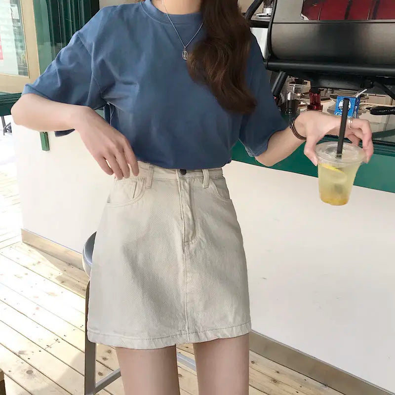 Add style and practicality to your everyday outfits with this A-line denim mini skirt. Made from durable and comfortable denim, it offers a light, elegant fit while enhancing the silhouette with its high-waisted design.